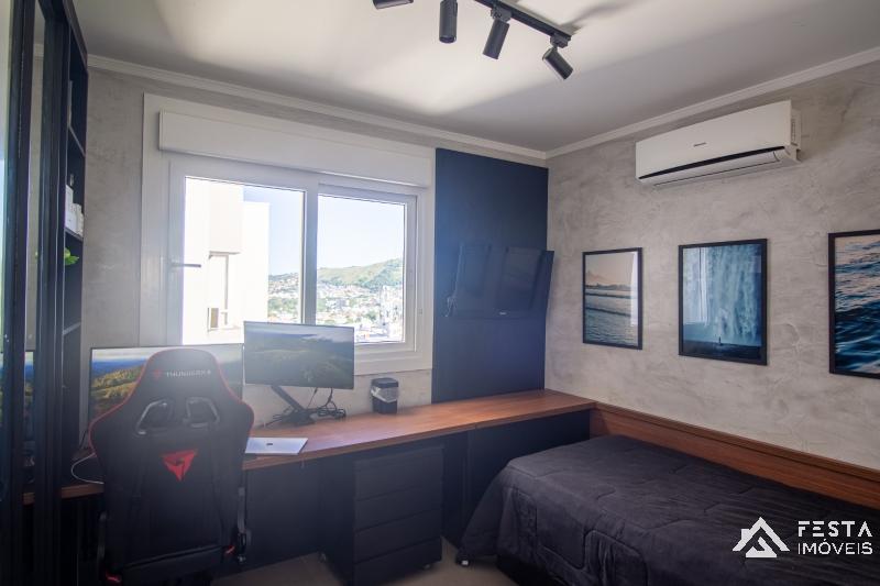O escritório possui móveis sob medida e cama planejada, que funciona como solteiro e se expande para casal, ideal para visitas.