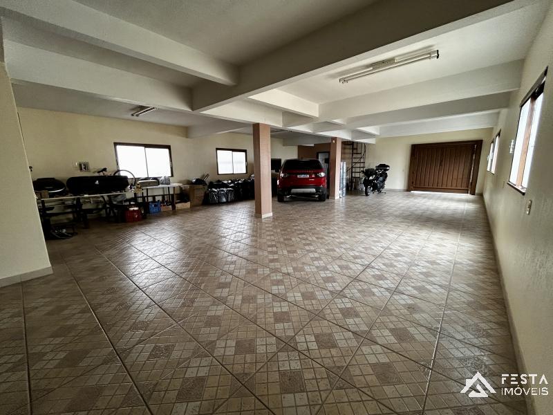 O andar térreo tem porta de garagem frontal, porta de garagem ao fundo com rampa, churrasqueira, pia com água quente, banheiro e a capacidade de abrigar até 7 veículos.